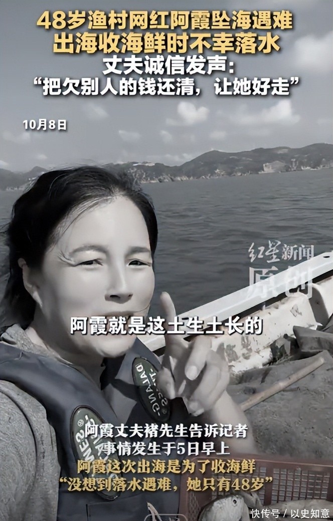 事发当晚,她的丈夫褚先生在朋友圈发布讣告:“爱妻阿霞出海收海鲜时不慎坠海,经全力搜救无效,不幸遇难。”